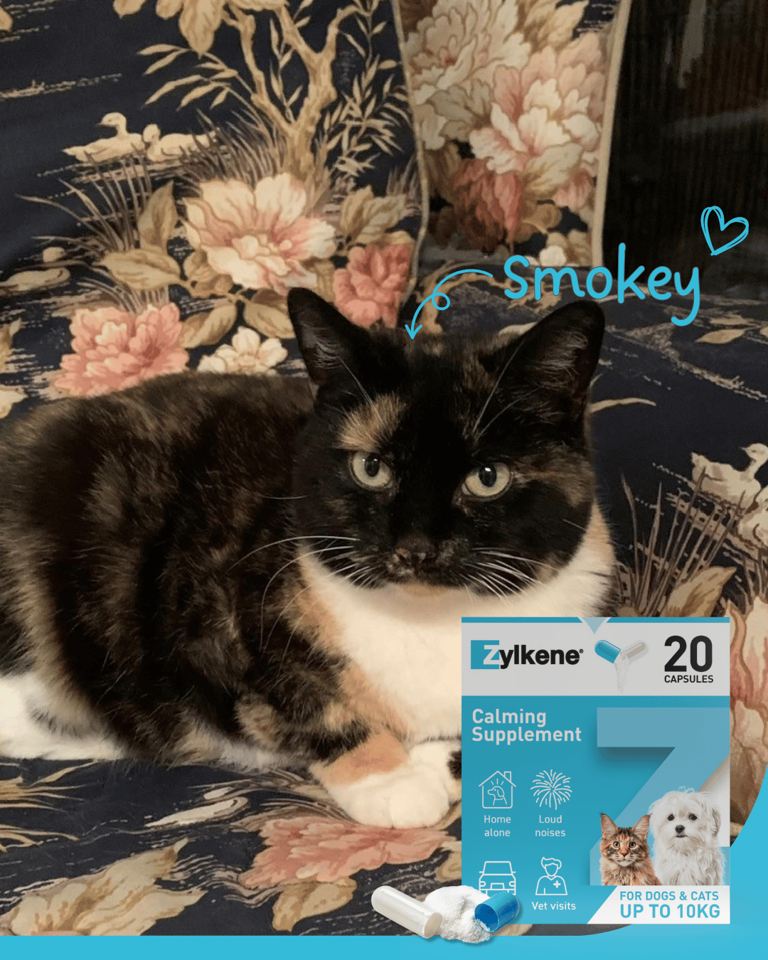 Zylkene🩵 really helped Smokey during fireworks. She’s always been very jumpy with loud noises and usually disappears for the whole evening, hiding away somewhere quiet and refusing to come out.